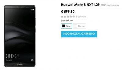 Dando uno sguardo alla foto presente qui sotto, il Mate 8 di Huawei dovrebbe arrivare nel nostro Paese ad un prezzo pari a 599,90 euro e in due colorazioni, ovvero: bianco e nero.