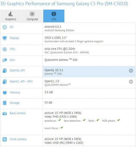 Proseguono senza sosta le apparizioni online del nuovo e tanto atteso smartphone Android Galaxy C5 Pro della casa produttrice Samsung che, dopo essere stato avvistato di recente sui database della WiFi Alliance e dell'ente di certificazione cinese TENAA, da qualche ora ha fatto visita anche al popolarissimo benchmark GFXBench.