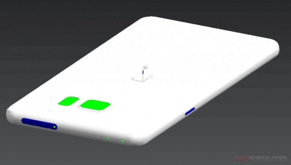 Anteriormente, rispetto agli ultimi scatti del pannello anteriore, troviamo qualche piccola differenza legata al tanto chiaccherato scanner dell'iride, infatti in questi render le lenti sono due e non tre, come viene confermato anche da qualche disegno e immagine di una primissima cover in vetro temperato di Olixar.