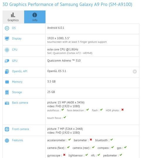 Concentrandoci fin da subito sulle specifiche Galaxy A9 Pro, secondo GFXBench dovrebbero essere le seguenti: