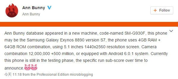 Entrando nel dettaglio, AnTuTu ha riportato un post rilasciato su Weibo, importante social network cinese in cui vengono rese note in anticipo le caratteristiche di un device targato Samsung con seguente nome in codice: SM-G930F e riconducibile alla versione FLAT con tanto di CPU Samsung Exynos 8890 del successore dell'S6.