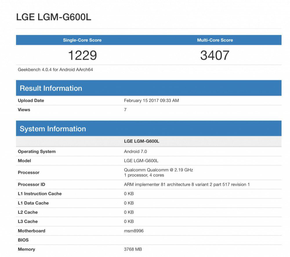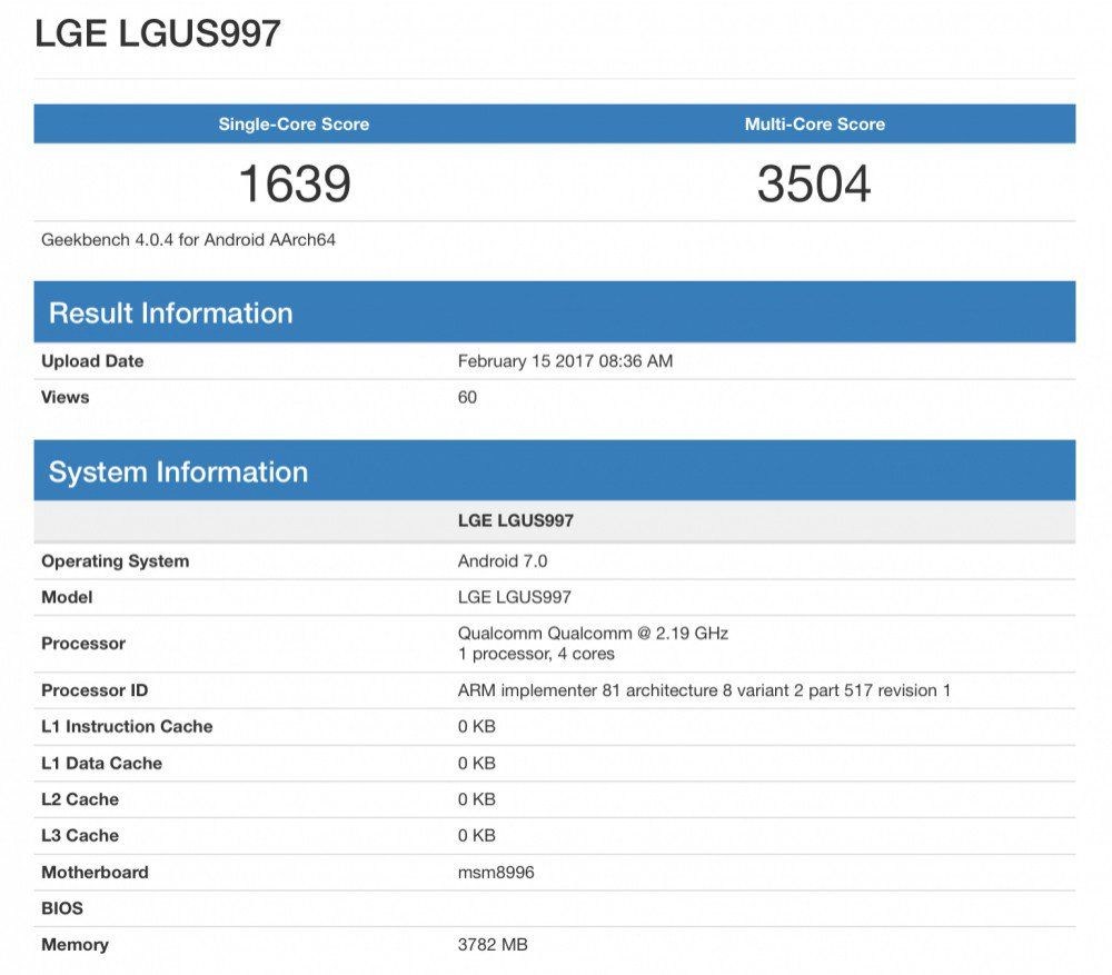 Tutte e due gli smartphone di LG trapelati su GeekBench sono caratterizzati da un quantitativo di memoria RAM pari a 4GB, CPU Snapdragon 820 di casa Qualcomm MSM8996 che agirà probabilmente ad una velocità di calcolo di 2.19 Ghz e nuova piattaforma operativa Android Nougat versione 7.0.